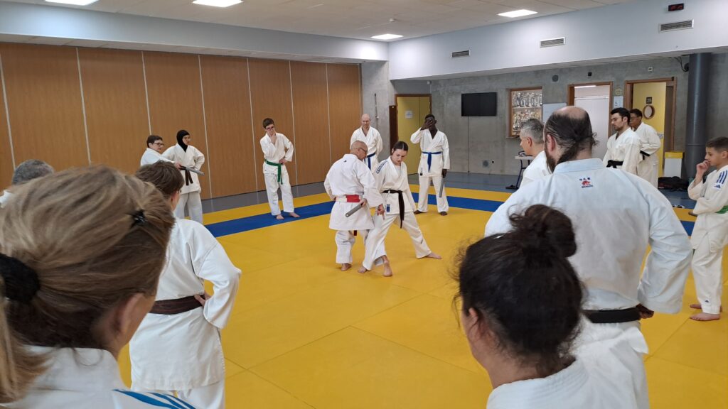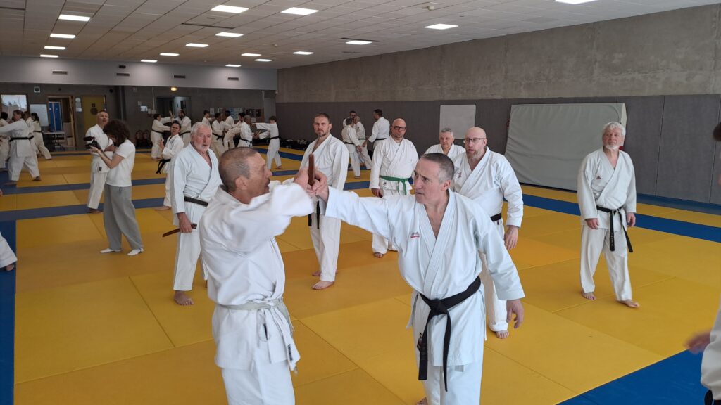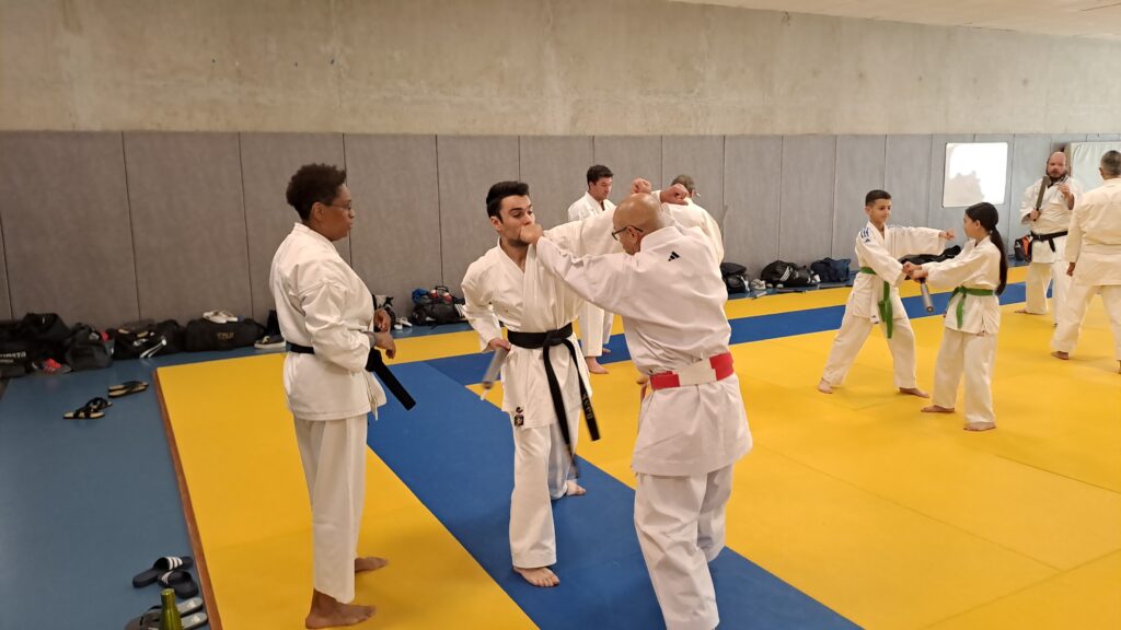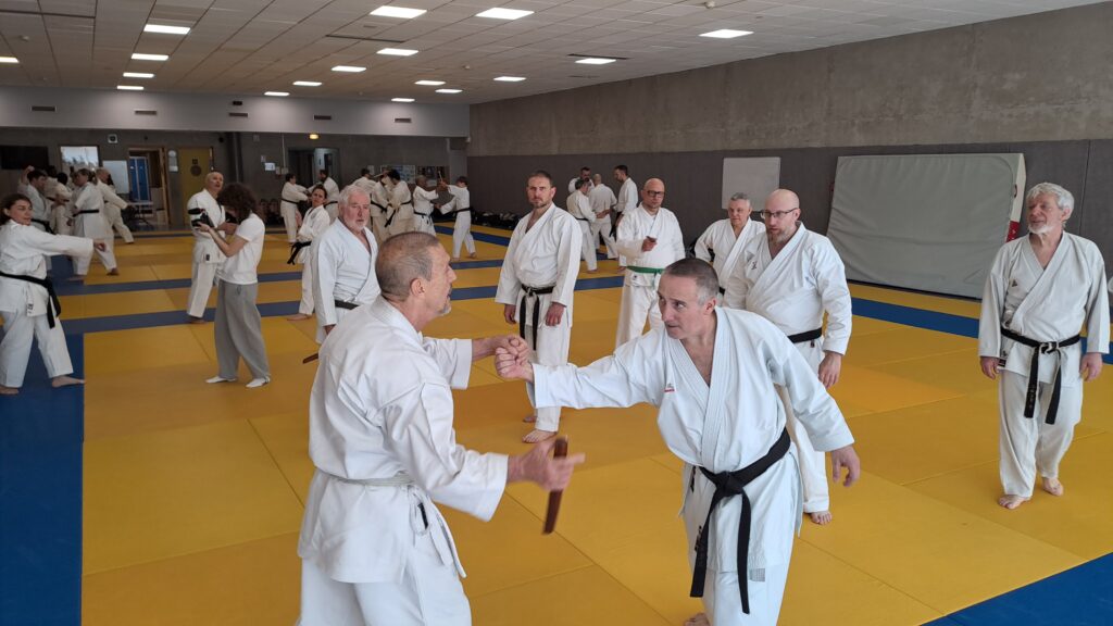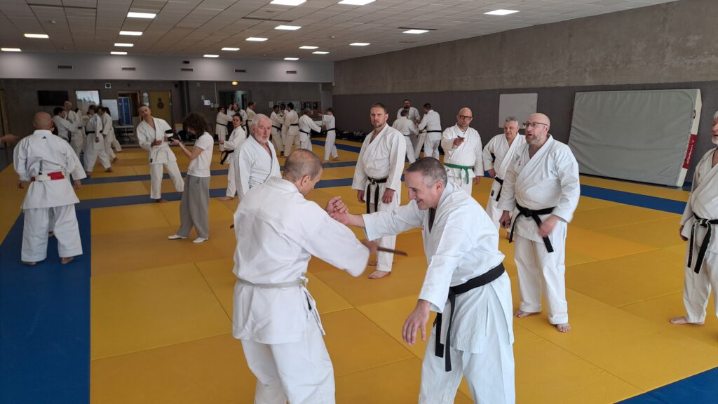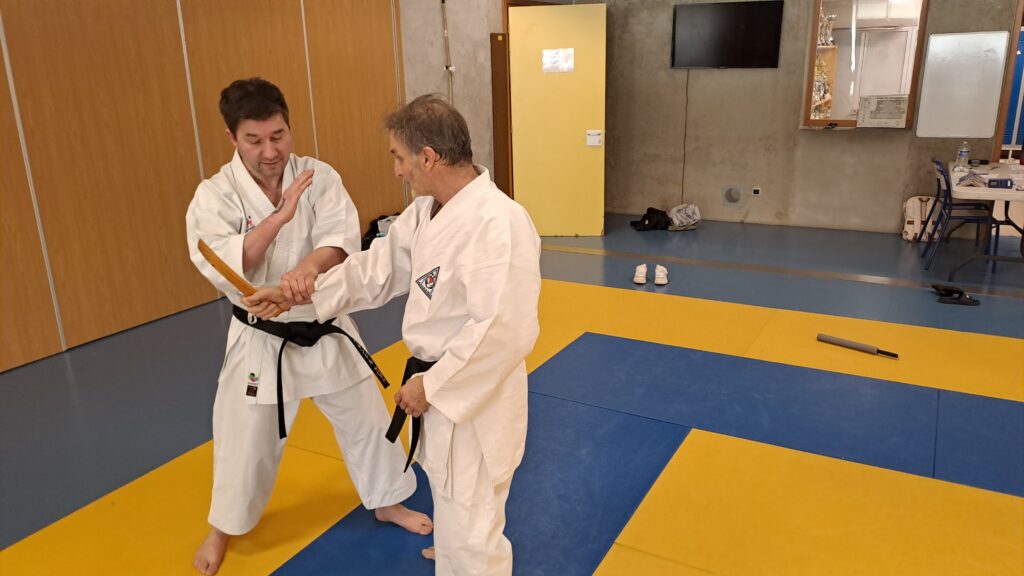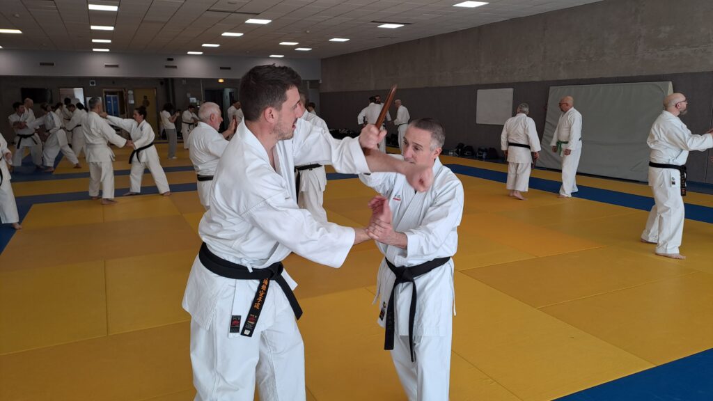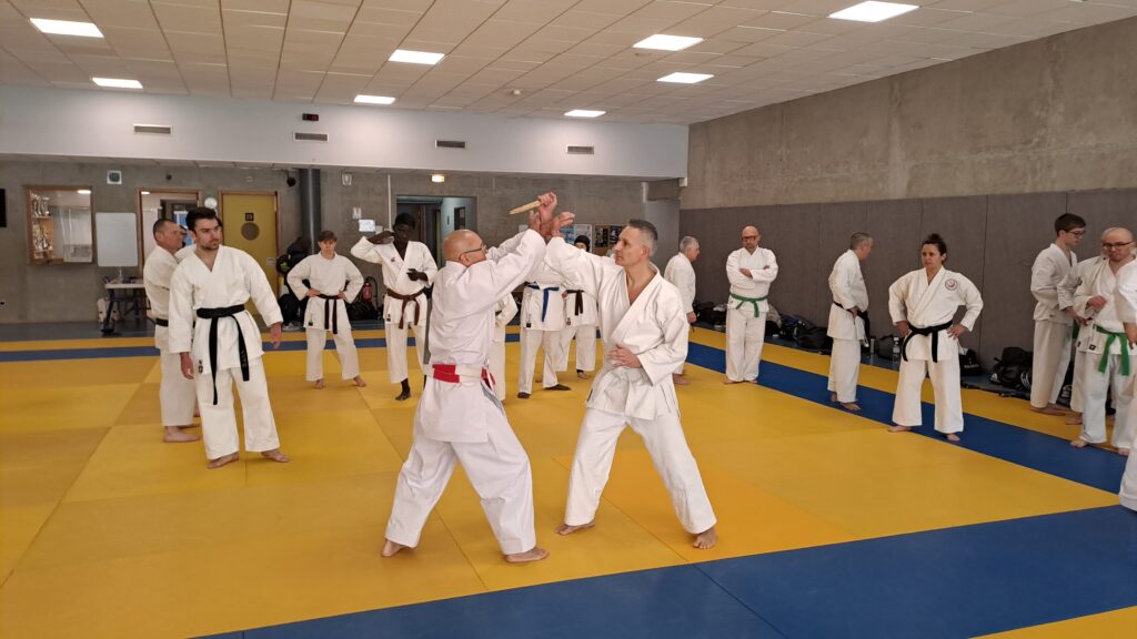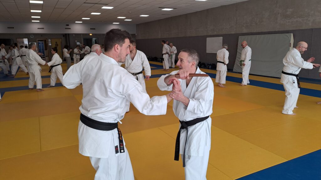 Quatre heures d’entrainement intense pour les stagiaires qui ont pu apprécier le travail au bâton court et au couteau sous la direction de ces deux experts en karaté et karaté défense.