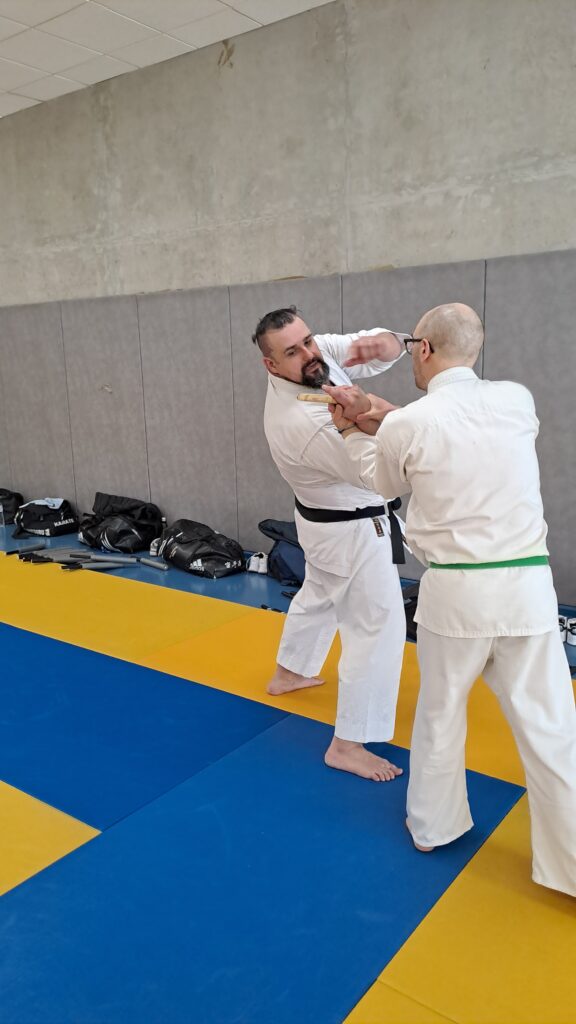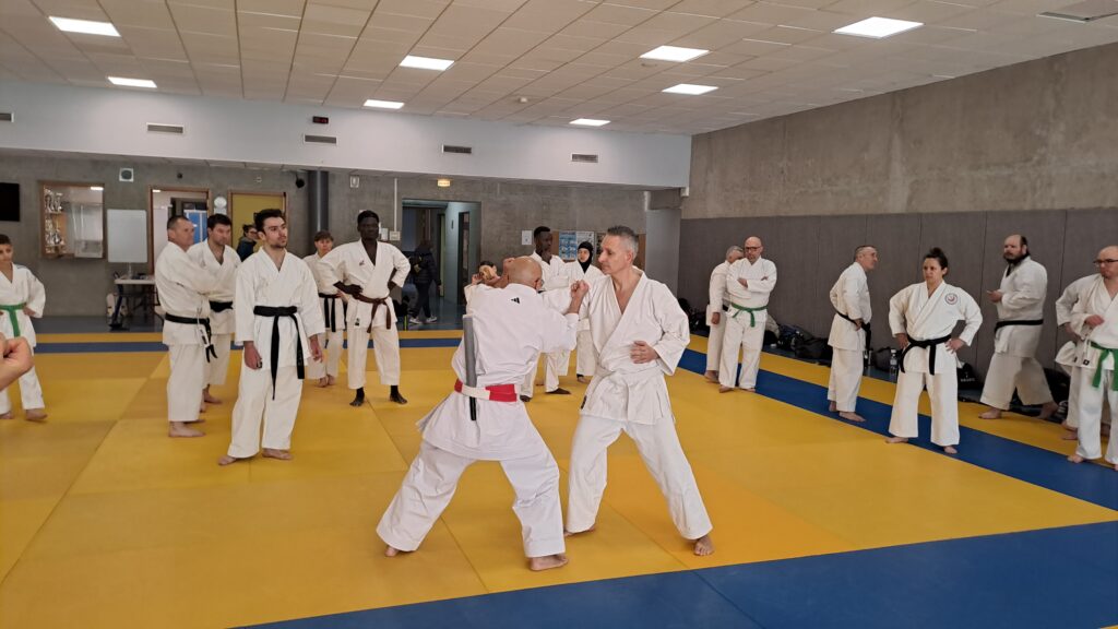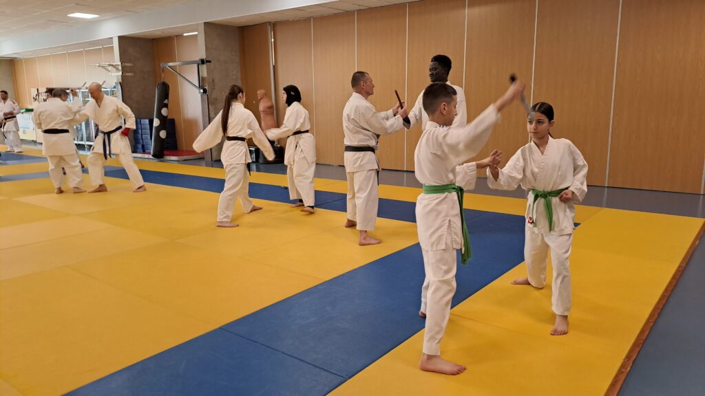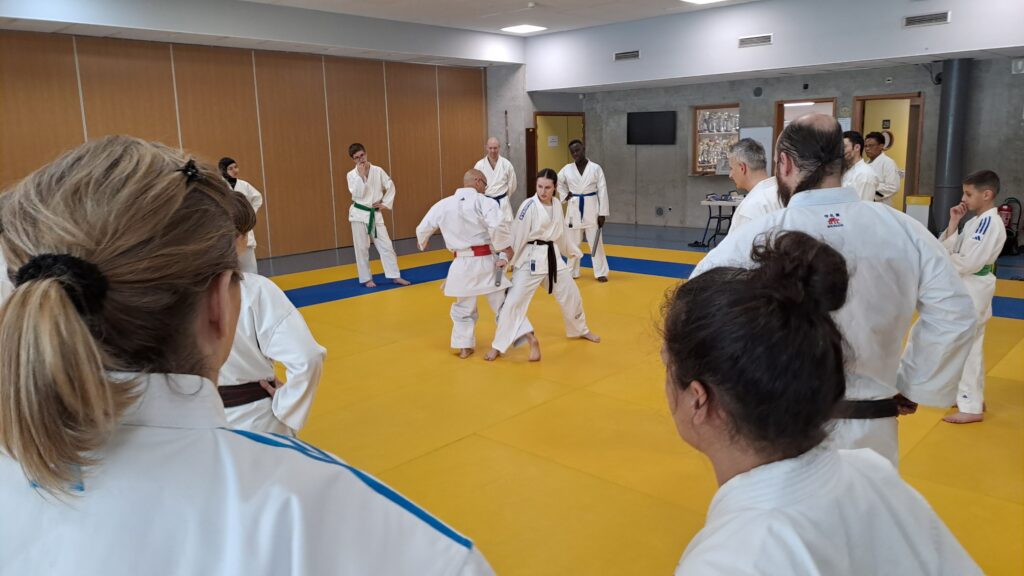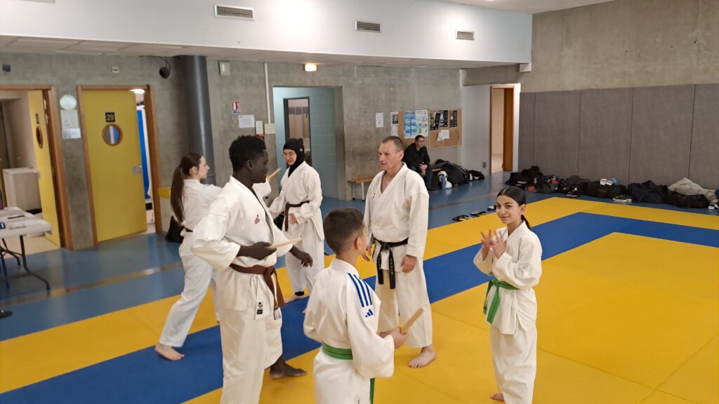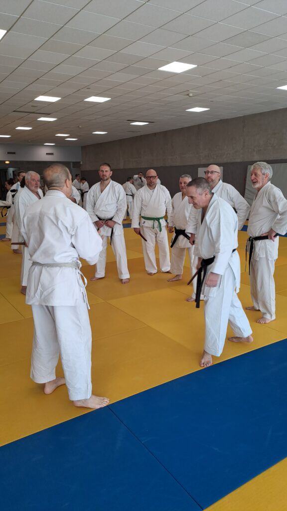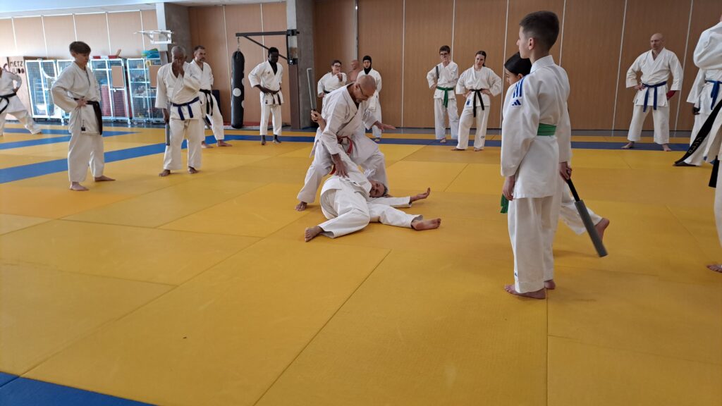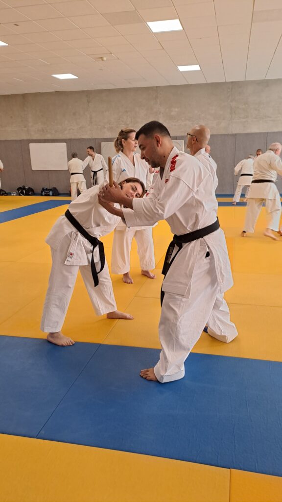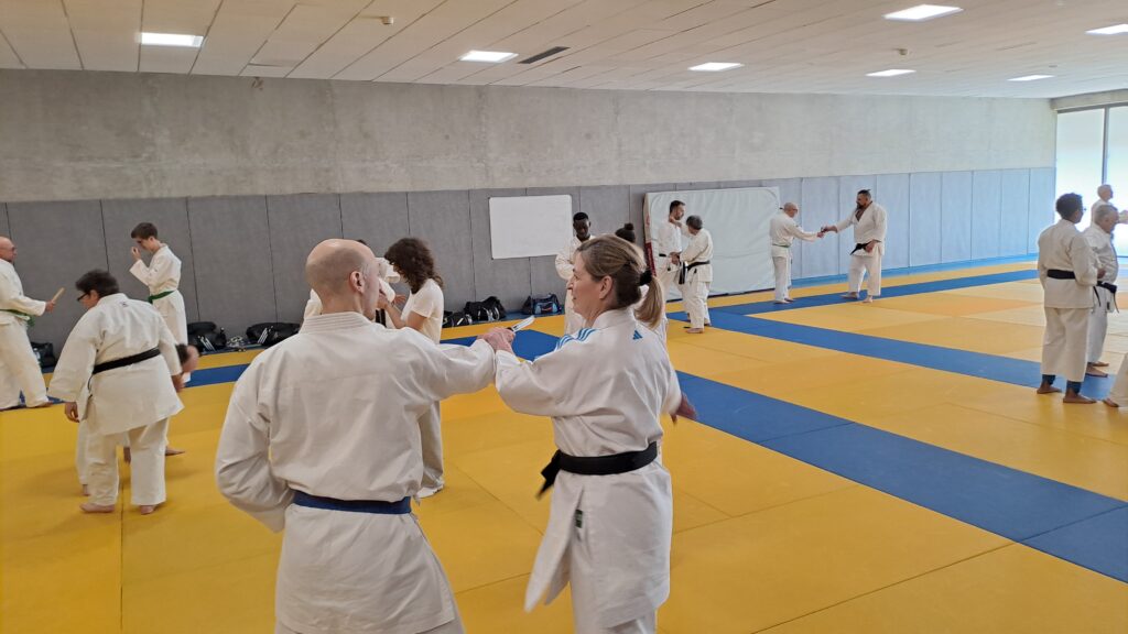 Quatre heures d’entrainement intense pour les stagiaires qui ont pu apprécier le travail au bâton court et au couteau sous la direction de ces deux experts en karaté et karaté défense.