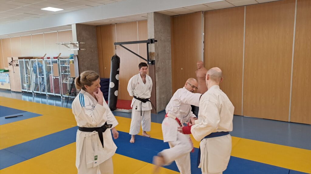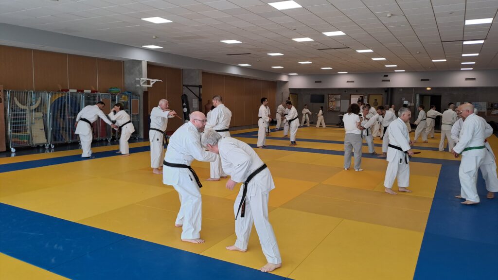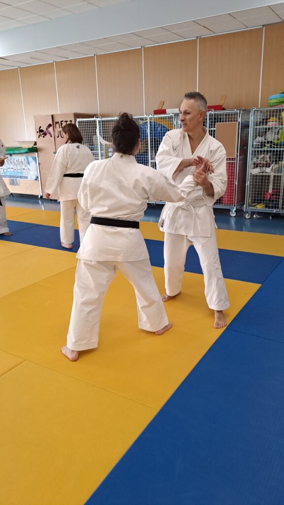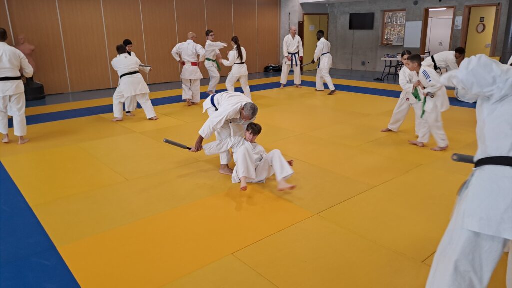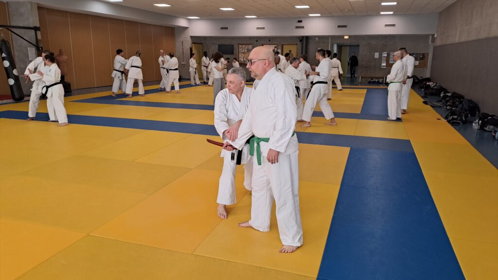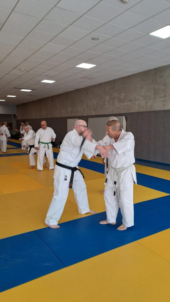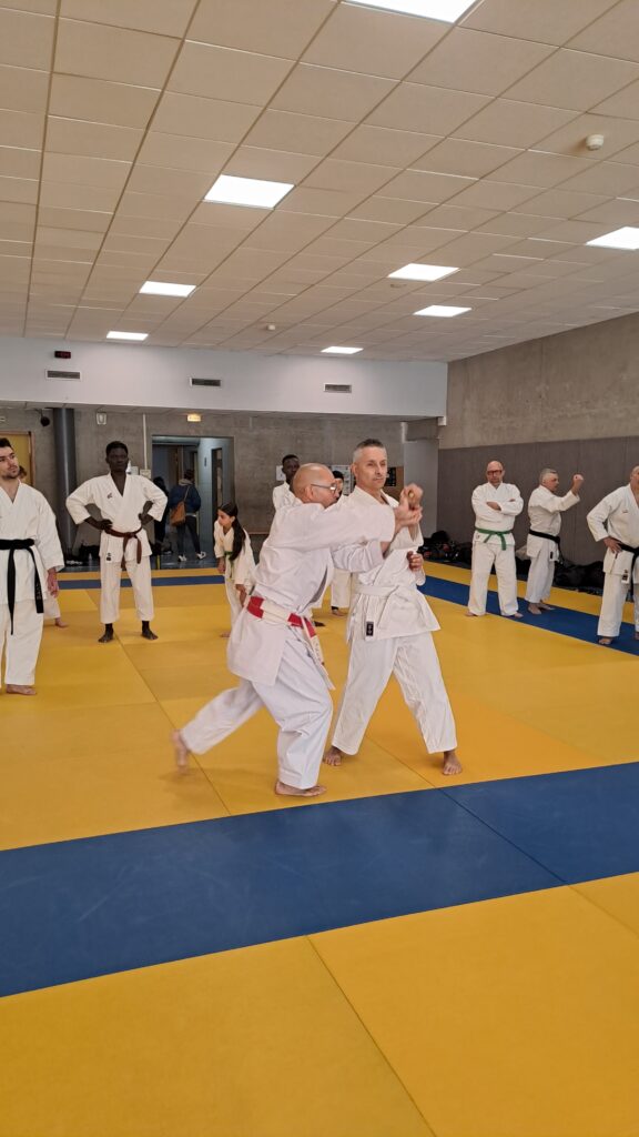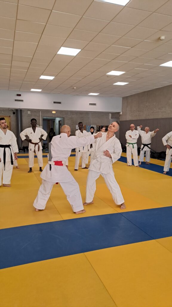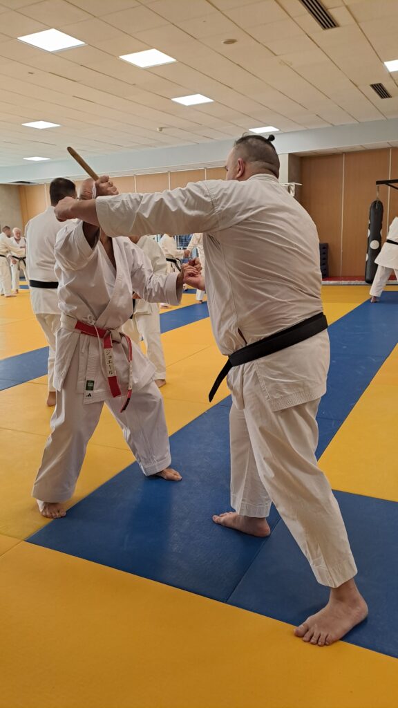 Quatre heures d’entrainement intense pour les stagiaires qui ont pu apprécier le travail au bâton court et au couteau sous la direction de ces deux experts en karaté et karaté défense.