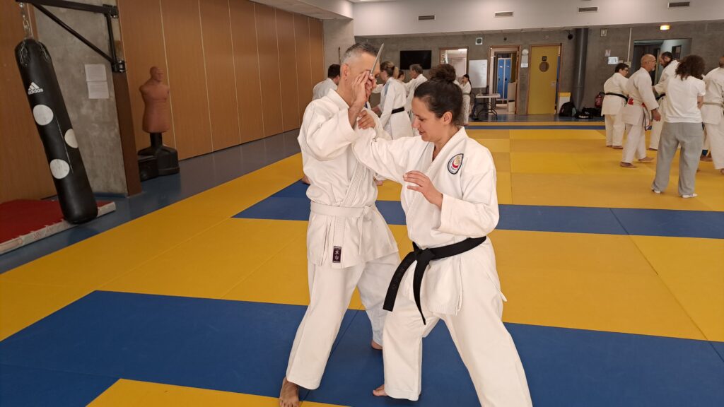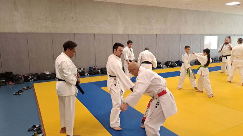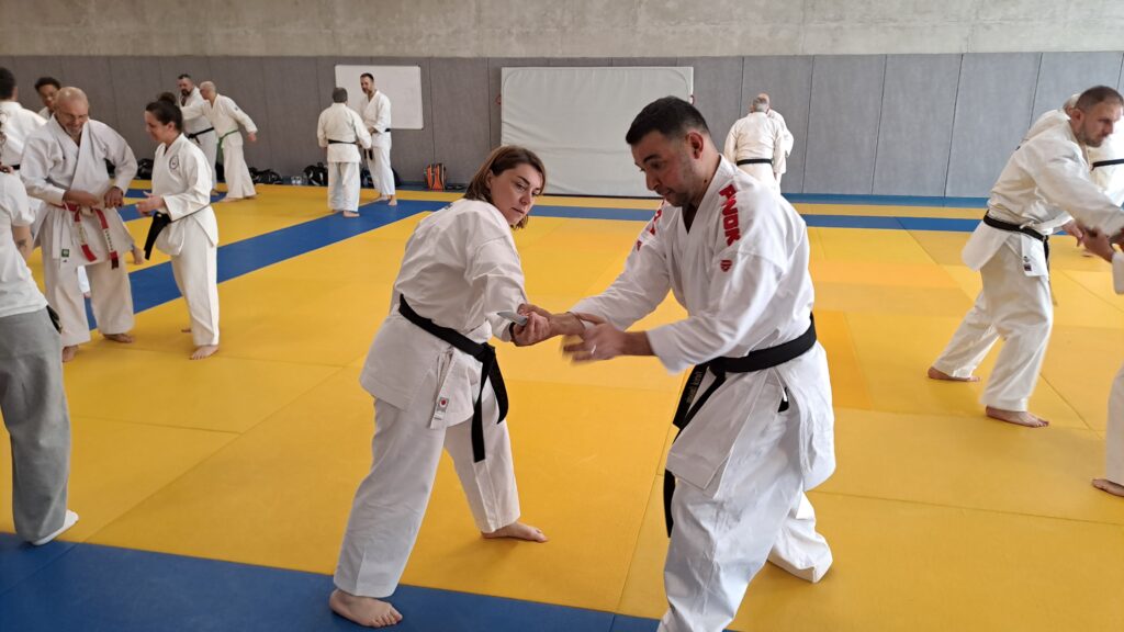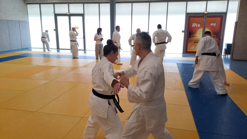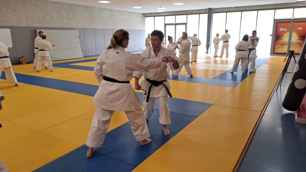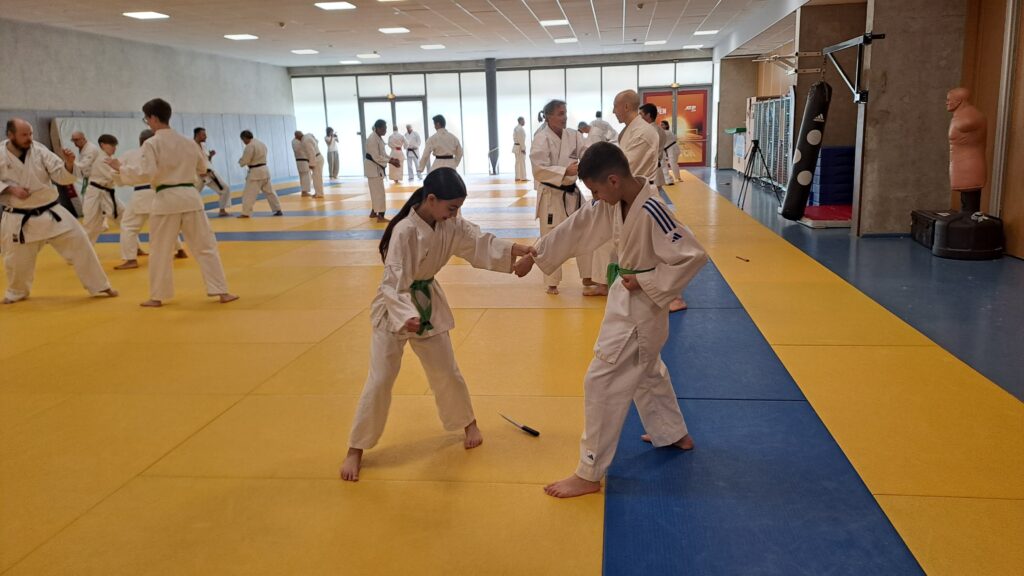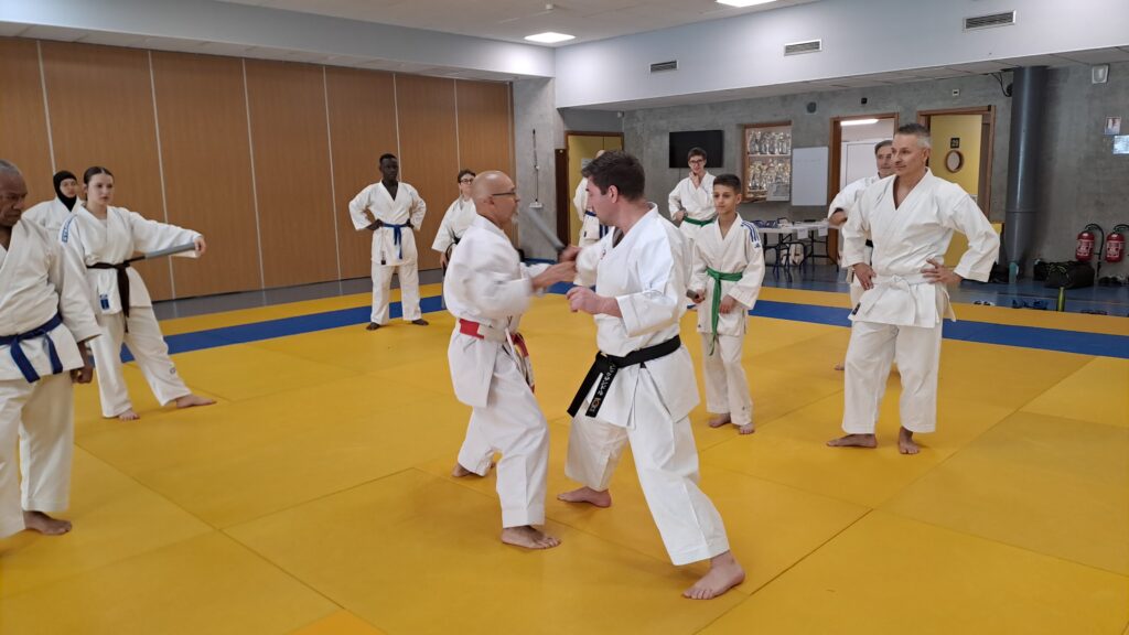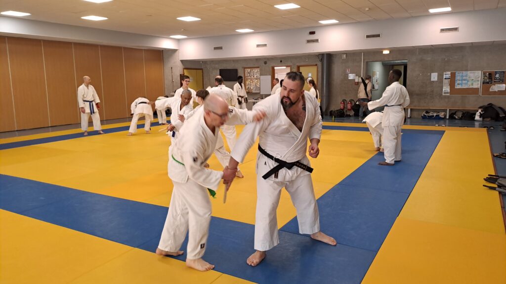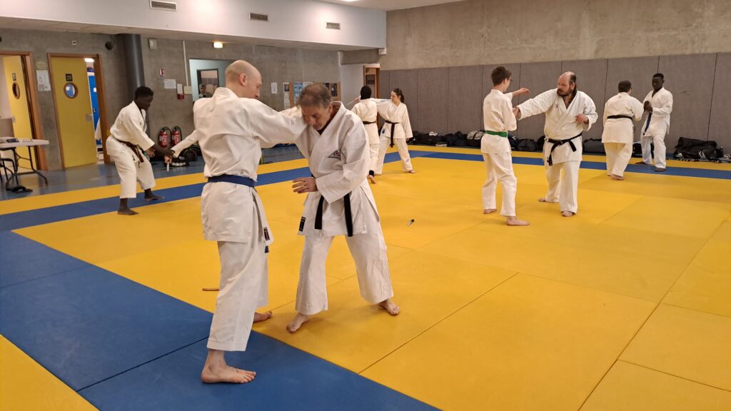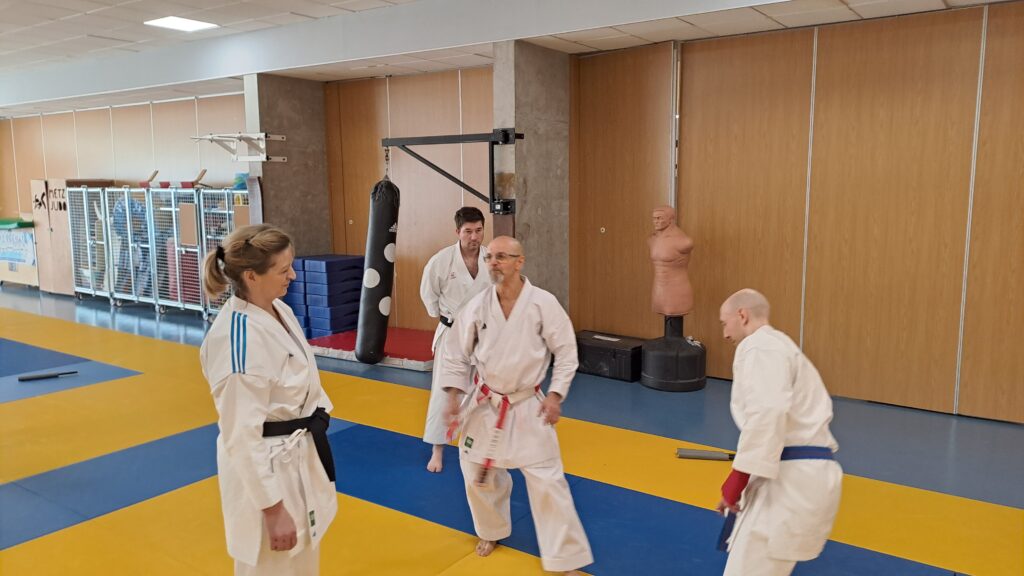 Quatre heures d’entrainement intense pour les stagiaires qui ont pu apprécier le travail au bâton court et au couteau sous la direction de ces deux experts en karaté et karaté défense.