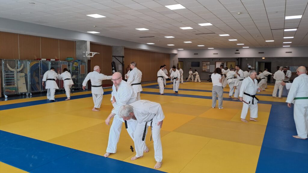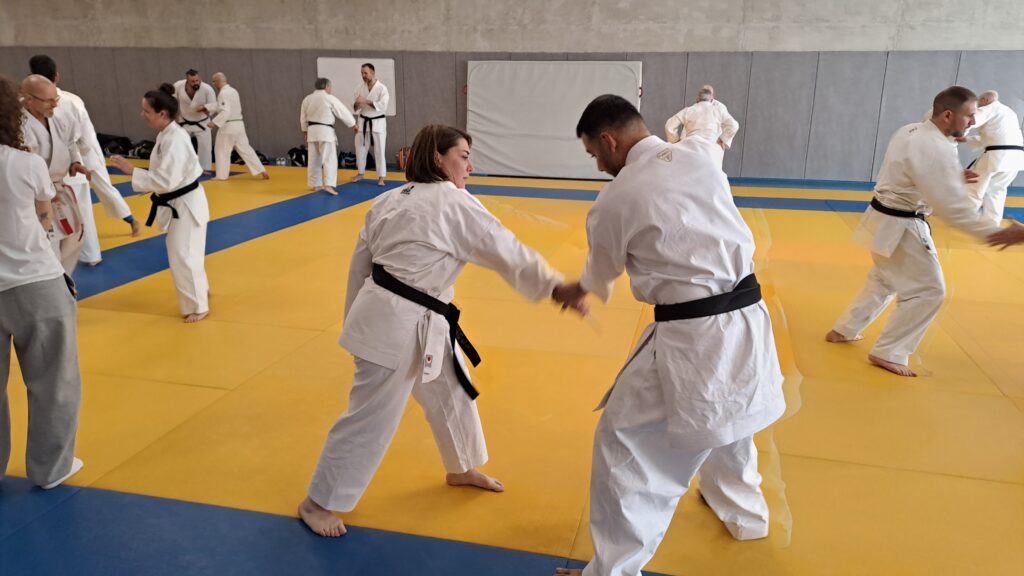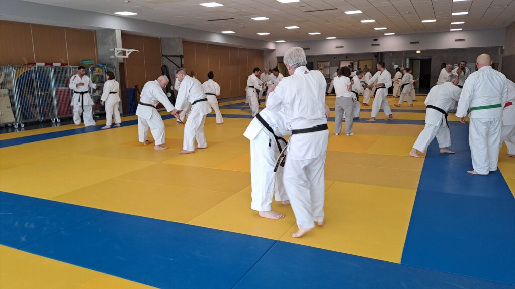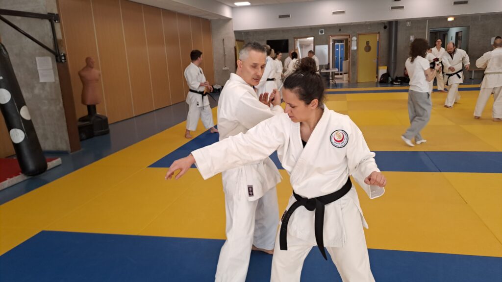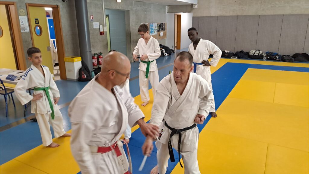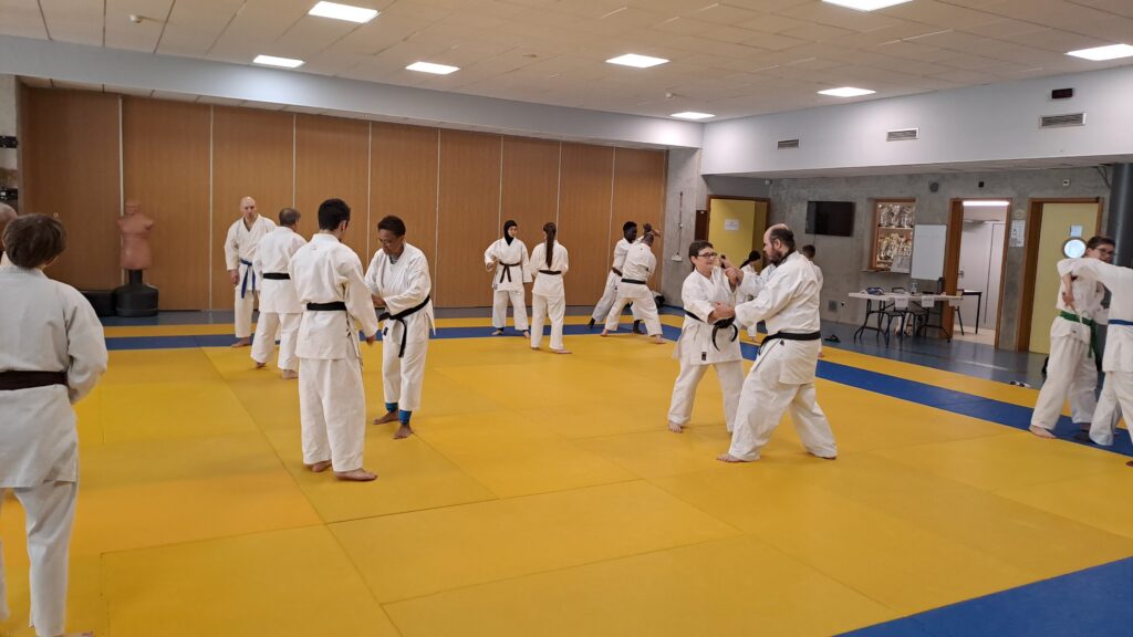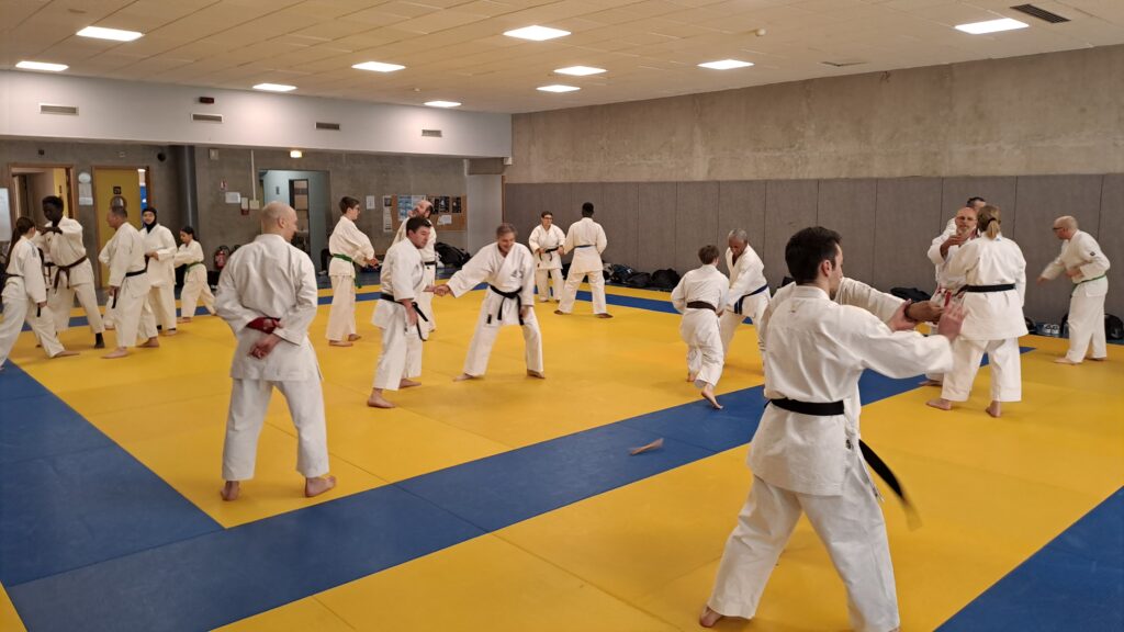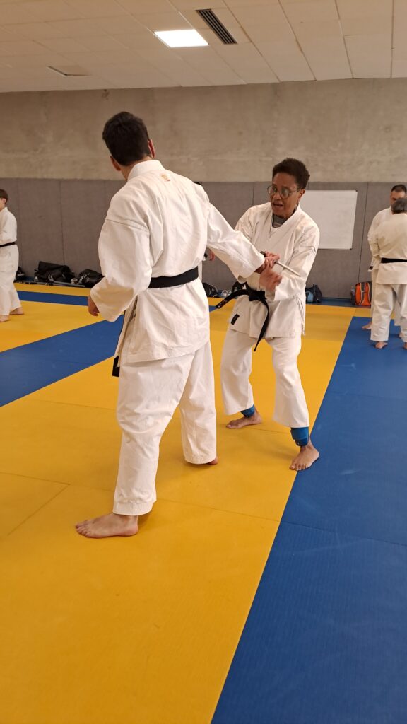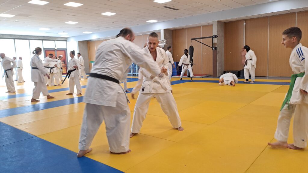 Quatre heures d’entrainement intense pour les stagiaires qui ont pu apprécier le travail au bâton court et au couteau sous la direction de ces deux experts en karaté et karaté défense.