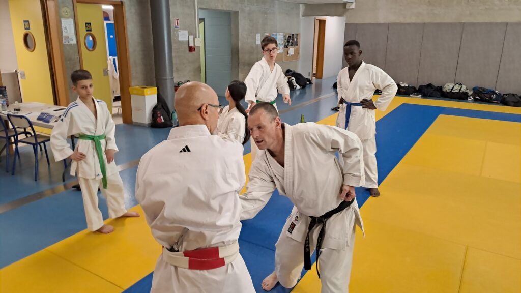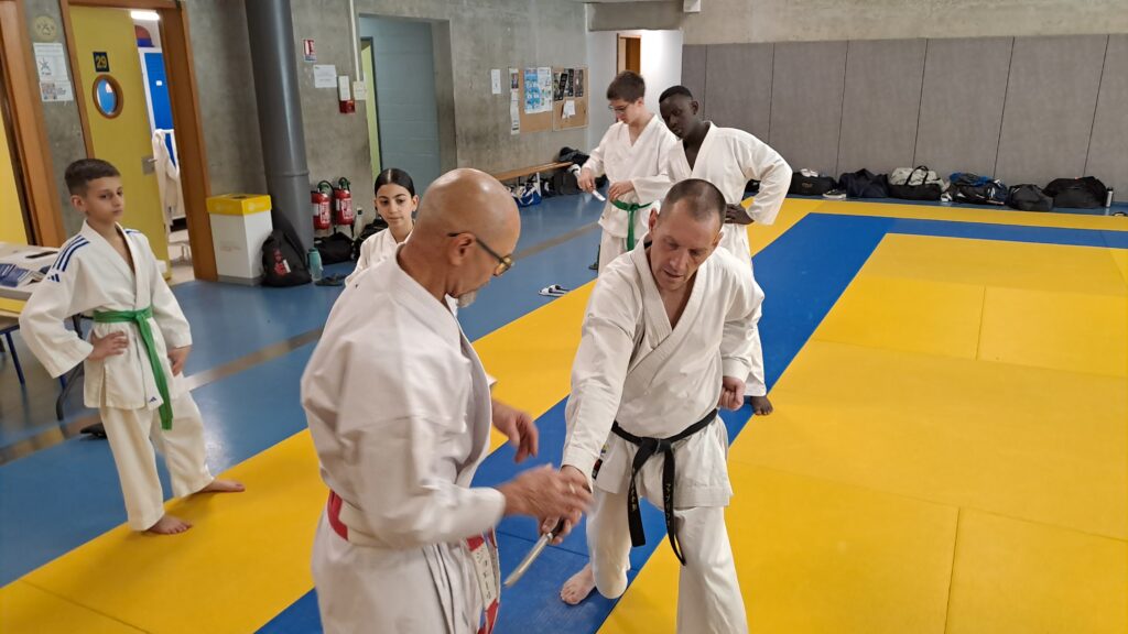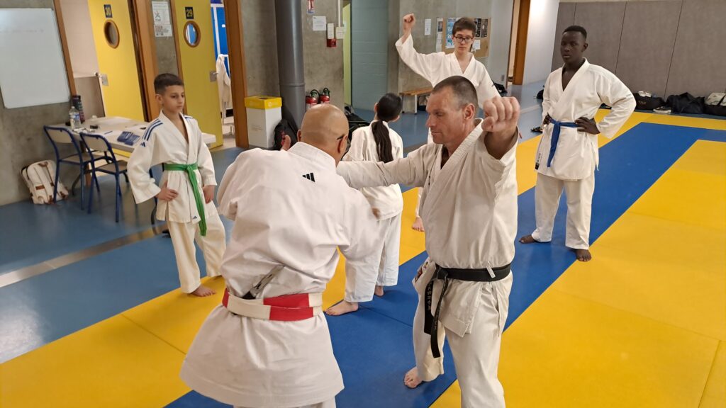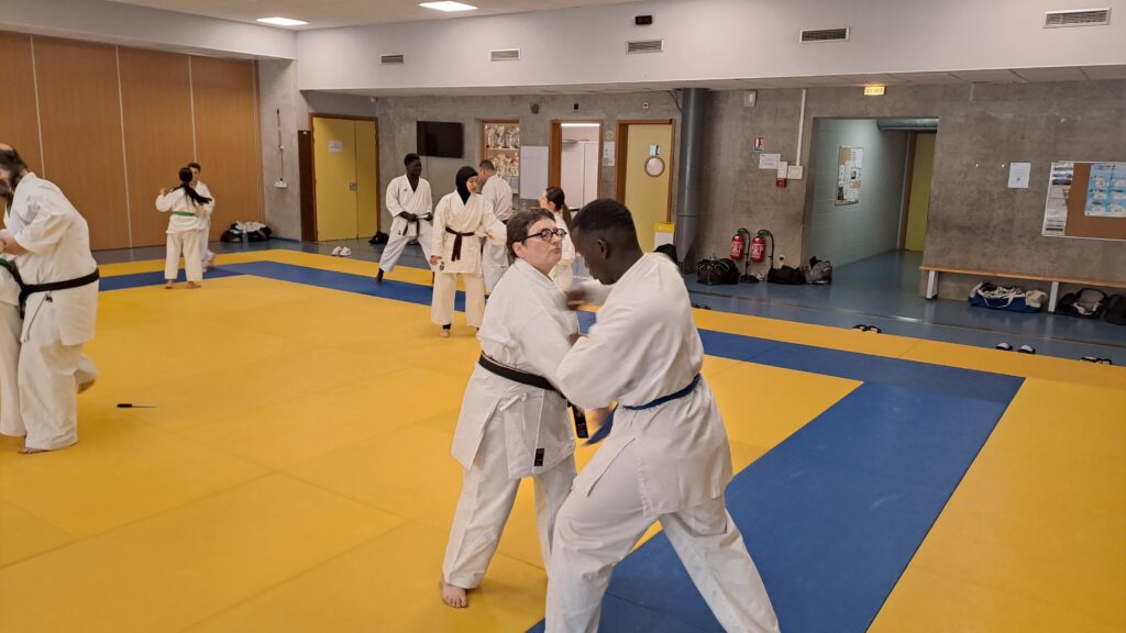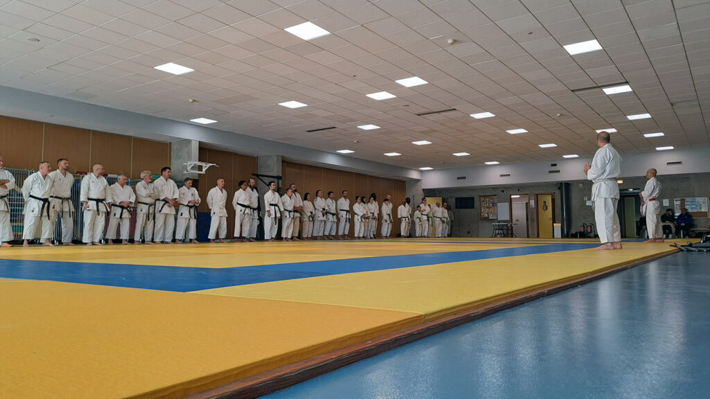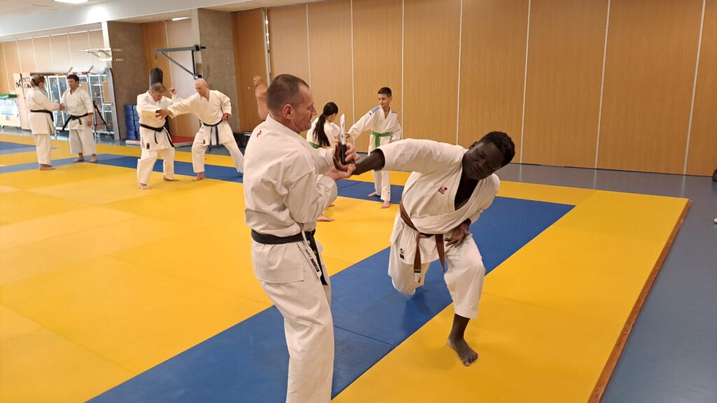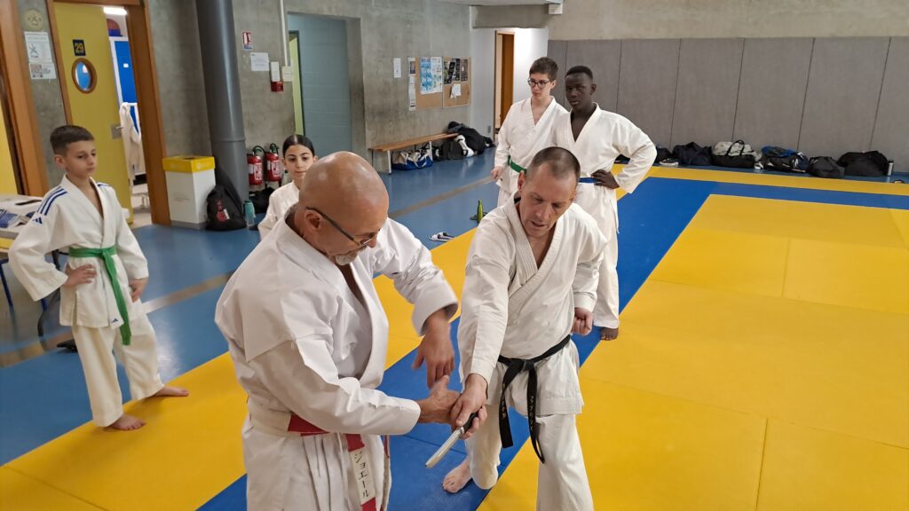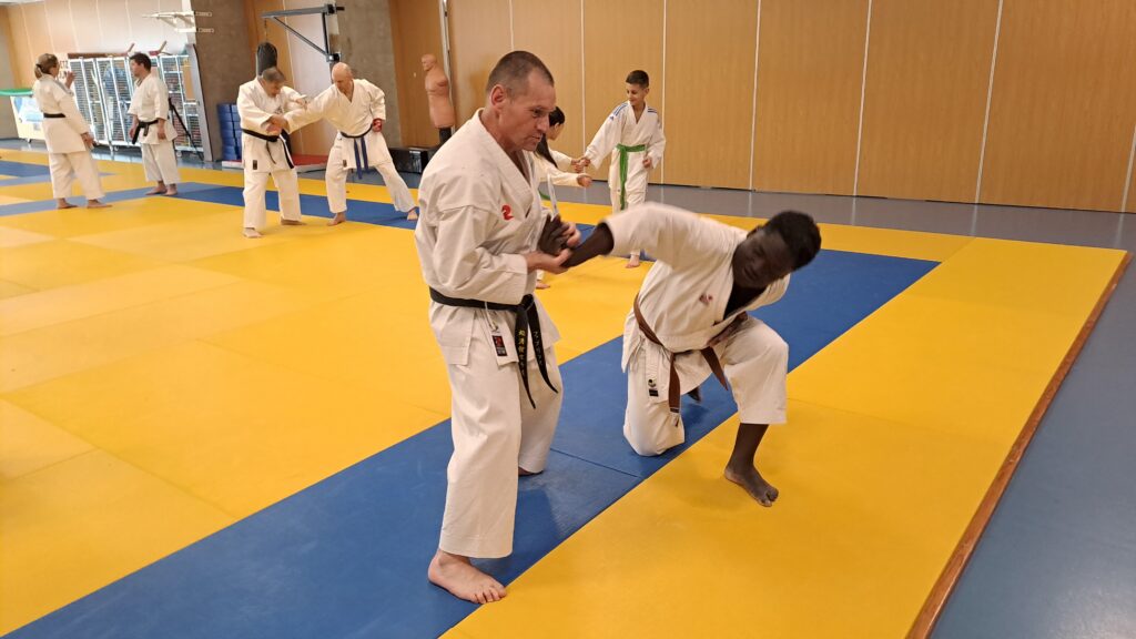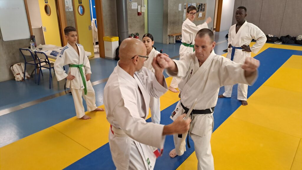 Quatre heures d’entrainement intense pour les stagiaires qui ont pu apprécier le travail au bâton court et au couteau sous la direction de ces deux experts en karaté et karaté défense.